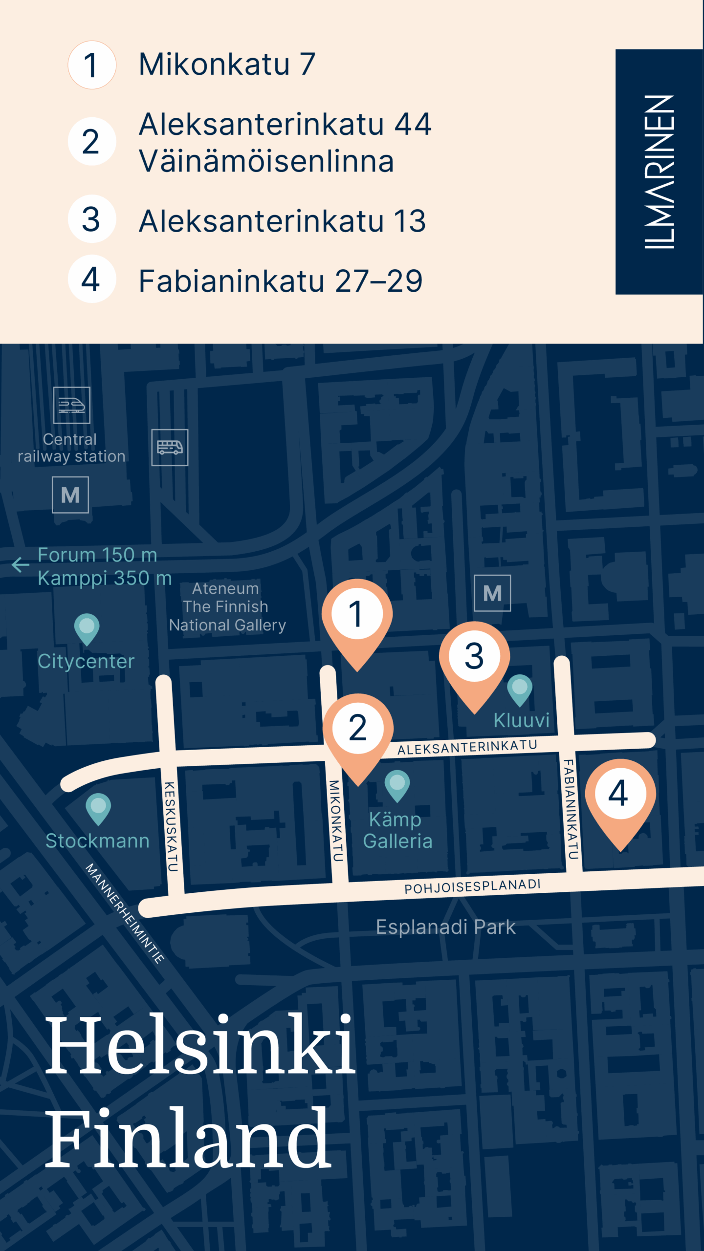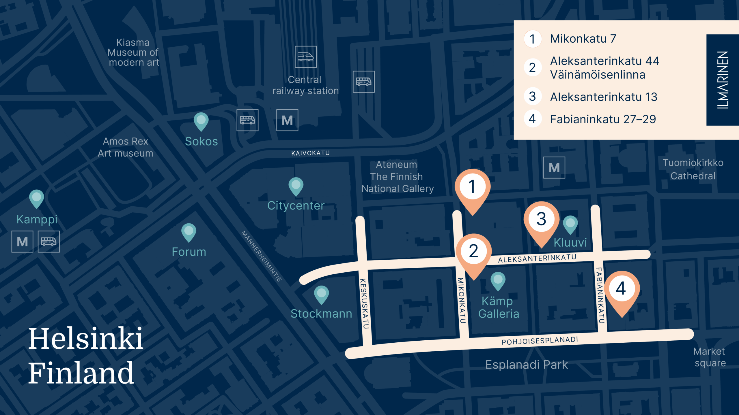 Keskustan parhaat liiketilat löytyvät Ilmarisen valikoimasta. Ne sijaitsevat kaupungin vilkkaimmilla alueilla ja arvostetuimmissa osoitteissa esimerkiksi Aleksanterinkadun, Esplanadin ja Mikonkadun varrella. Alueilla, jotka huokuvat historiaa, arvokkuutta ja korkeaa laatua. Ei siis ihme, että useat menestyvät huippubrändit ja lippulaivamyymälät ovat valinneet Ilmarisen liiketilakumppanikseen.