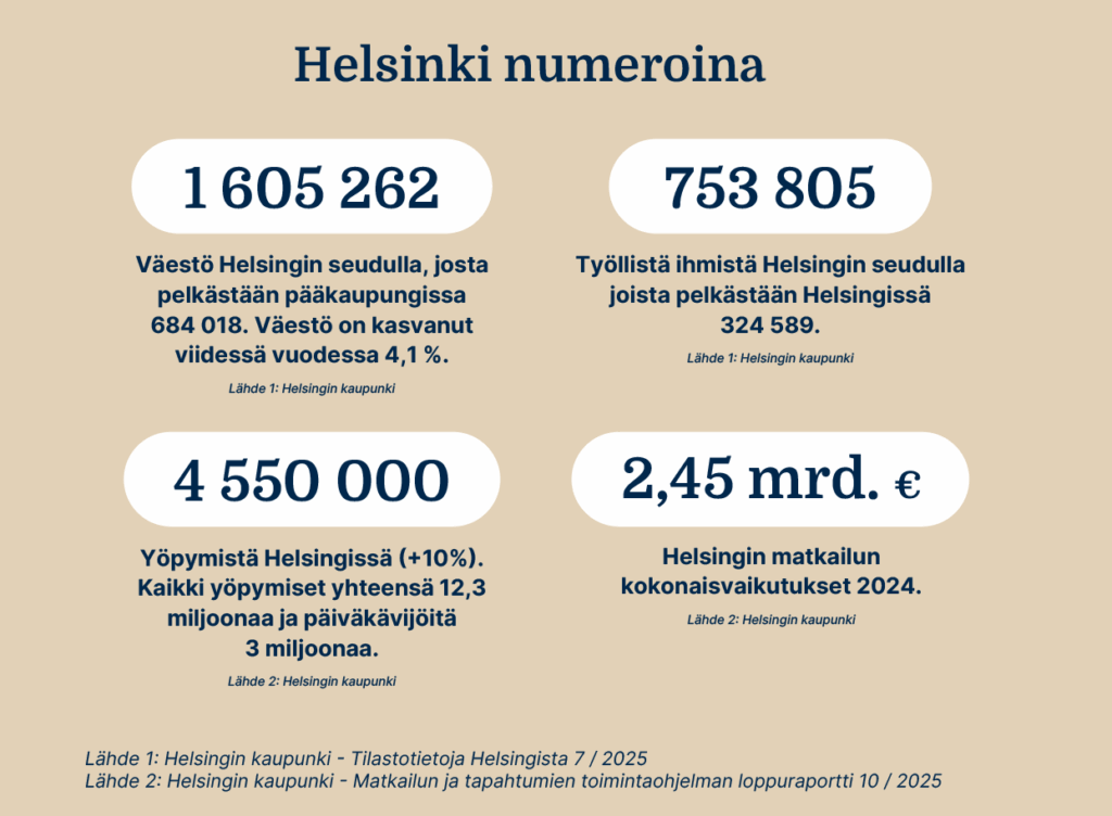Helsingin suosiota ovat kasvattaneet vahva kulttuurielämä, uniikit tapahtumat, monipuolinen ruoka- ja ravintolatarjonta ja design, sekä luonnonläheisyys ja merellisyys. Merkityksellistä on myös Helsingin panostus kestävään matkailuun, mikä houkuttelee erityisesti ostovoimaisia ja elämyshakuisia matkailijoita. Helsinki on maailmalta katsottuna eksoottinen kohde, jossa ei ole kesällä turhan kuuma ja jossa ei ole Etelä-Euroopalle tyypillisiä massamatkailun lieveilmiöitä. Suomen valinta kahdeksannen kerran maailman onnellisemmaksi maaksi sekä sen myötä lanseerattu Happy Helsinki -kattoteema ovat omalta osaltaan lisänneet kiinnostusta Helsinkiä kohtaan.